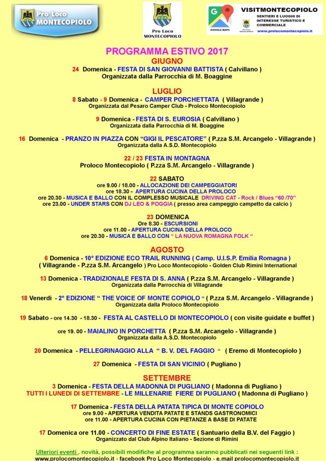 La Pro-loco Montecopiolo ha presentato il programma estivo 2017. Ogni singolo evento presente nel nostro comune, verrà pubblicizzato con apposite locandine e attraverso articoli sul nostro sito web e sulla nostra pagina facebook. Per tutte le informazioni vi invitiamo quindi a consultare il nostro sito internet www.prolocomontecopiolo.it.