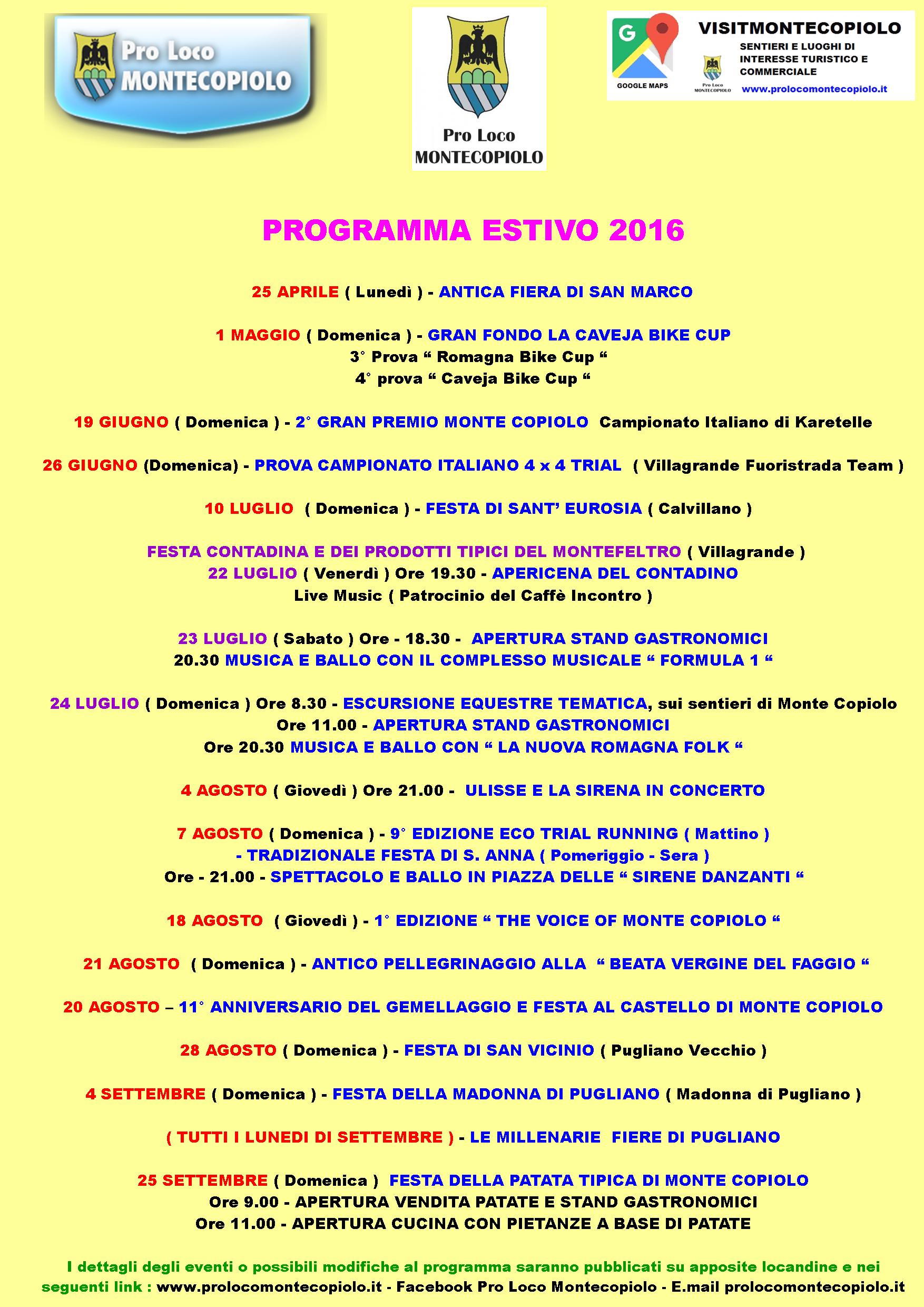 La Pro-loco Montecopiolo ha presentato il programma estivo 2016. Ogni singolo evento presente nel nostro comune, verrà pubblicizzato con apposite locandine e attraverso articoli sul nostro sito web e sulla nostra pagina facebook. Per tutte le informazioni vi invitiamo quindi a consultare il nostro sito internet www.prolocomontecopiolo.it.